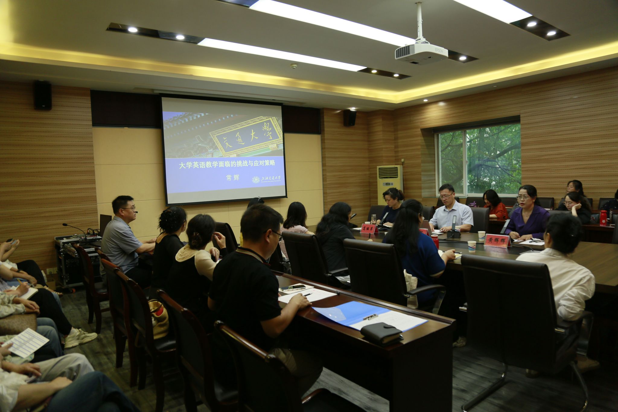 常辉教授围绕当前大学英语教学中学分课时减少、个性化需求增强、人才培养深度不足以及教学费时低效等突出问题,结合上海交通大学在精简课时、增强个性化支持、深化专业服务和聚焦提质增效等方面的一系列具体实践,系统展示了该校在大学英语教学改革中的有效探索,为我院推动大英教学的内容调整与模式创新提供了重要参考。