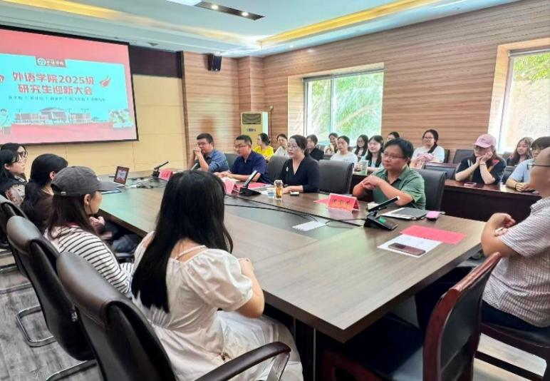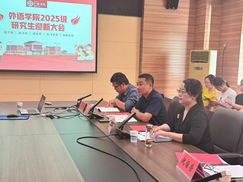 2025年9月8日,外语学院在5231会议室隆重举行2025级研究生开学典礼暨新生入学教育。院长黄辉辉教授、党委书记王云涛、副书记王晓东、副院长沈国荣及全体2025级研究生新生参加典礼。典礼由学科科研研究生办公室主任孟令维主持。