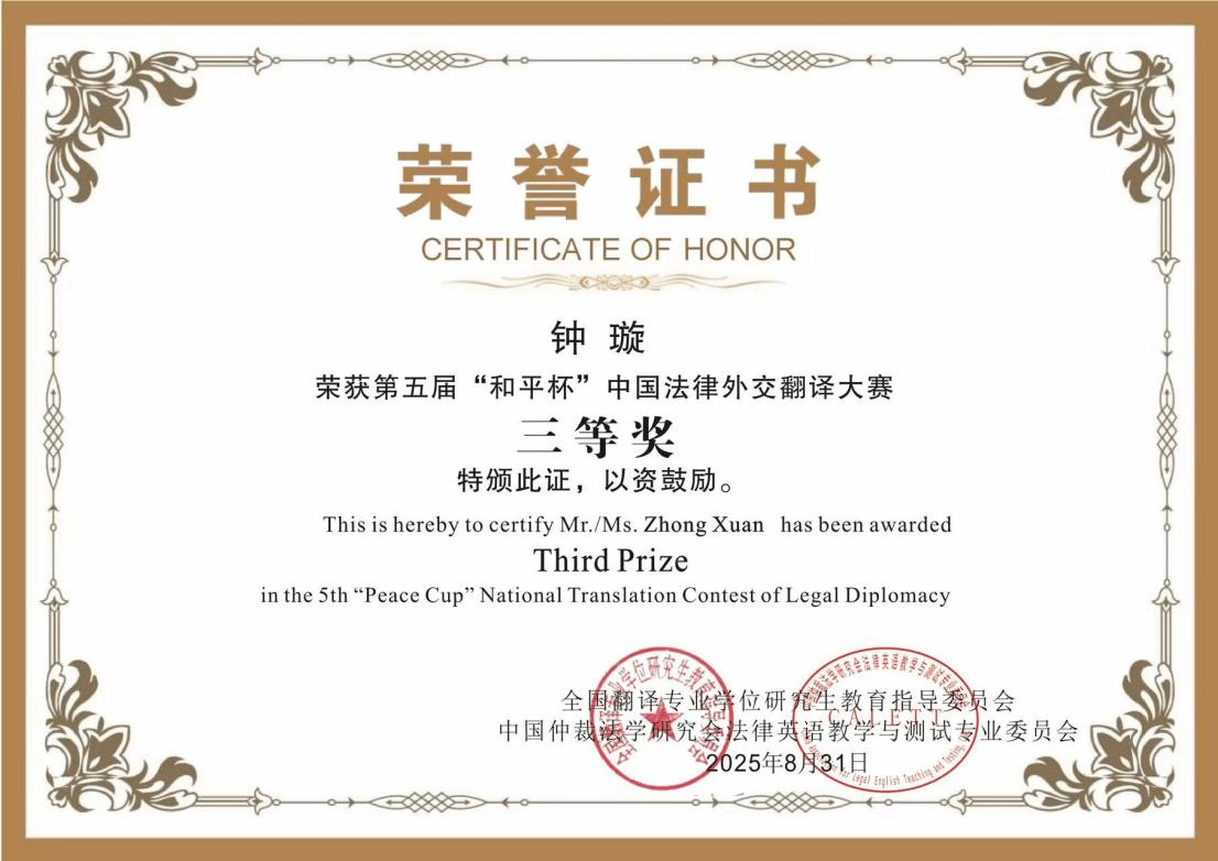 近日,2025年第五届“和平杯”中国法律翻译外交翻译大赛圆满落幕。我校外语学院2022级翻译专业学生张炜诚、钟璇在外语学院教师杜巧阁指导下,凭借扎实的英语功底与深厚的法律翻译素养,在大赛中荣获三等奖,展现我校学子在法律翻译领域的强劲实力。