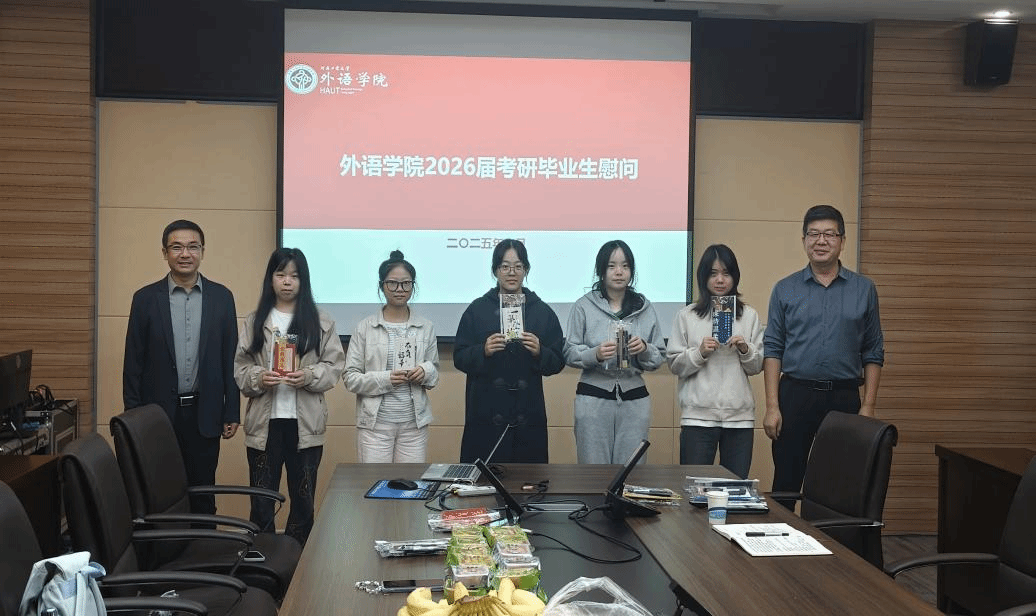 为鼓舞我院学子考研士气,坚定考研信心,缓解备考压力,10月6日上午,外语学院在博闻楼5231会议室开展2026届本科生考研慰问活动,学院党委书记王云涛、党委副书记王晓东一同为考研学子送去温暖关怀和美好祝愿。