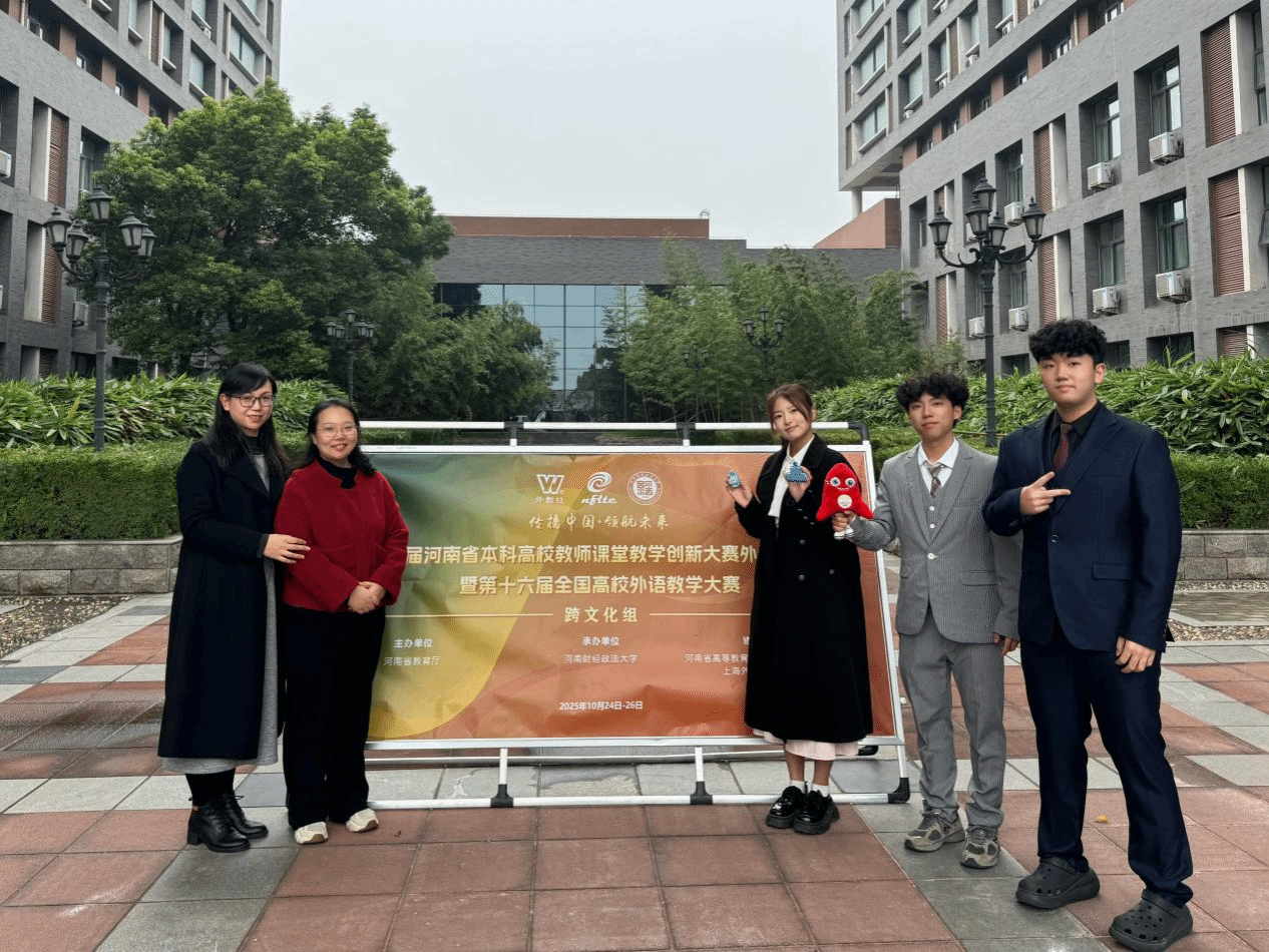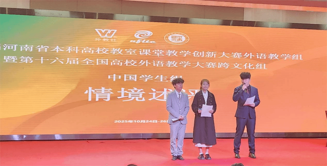 2025年10月26日,第六届河南省本科高校教师课堂教学创新大赛外语组暨第十六届全国高校外语教学大赛河南赛区(跨文化组)决赛圆满落幕。由我院蒋智敏、张艳老师及其指导的学生团队,凭借其深厚的专业素养、卓越的跨文化沟通能力与高效的团队协作精神,经激烈角逐荣获大赛一等奖。