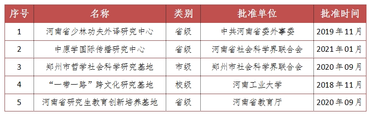 中原特色传统文化翻译与传播中心依托武术、粮食、黄河文化为优势特色,传承和弘扬有深厚历史积淀的中华优秀粮食文化、武术文化,服务国家粮食安全战略,为学校优势特色学科对外合作交流提供语言服务保障,2020年获批郑州市哲学社会科学研究基地。